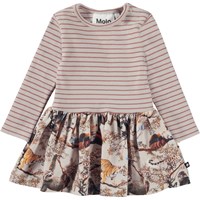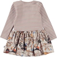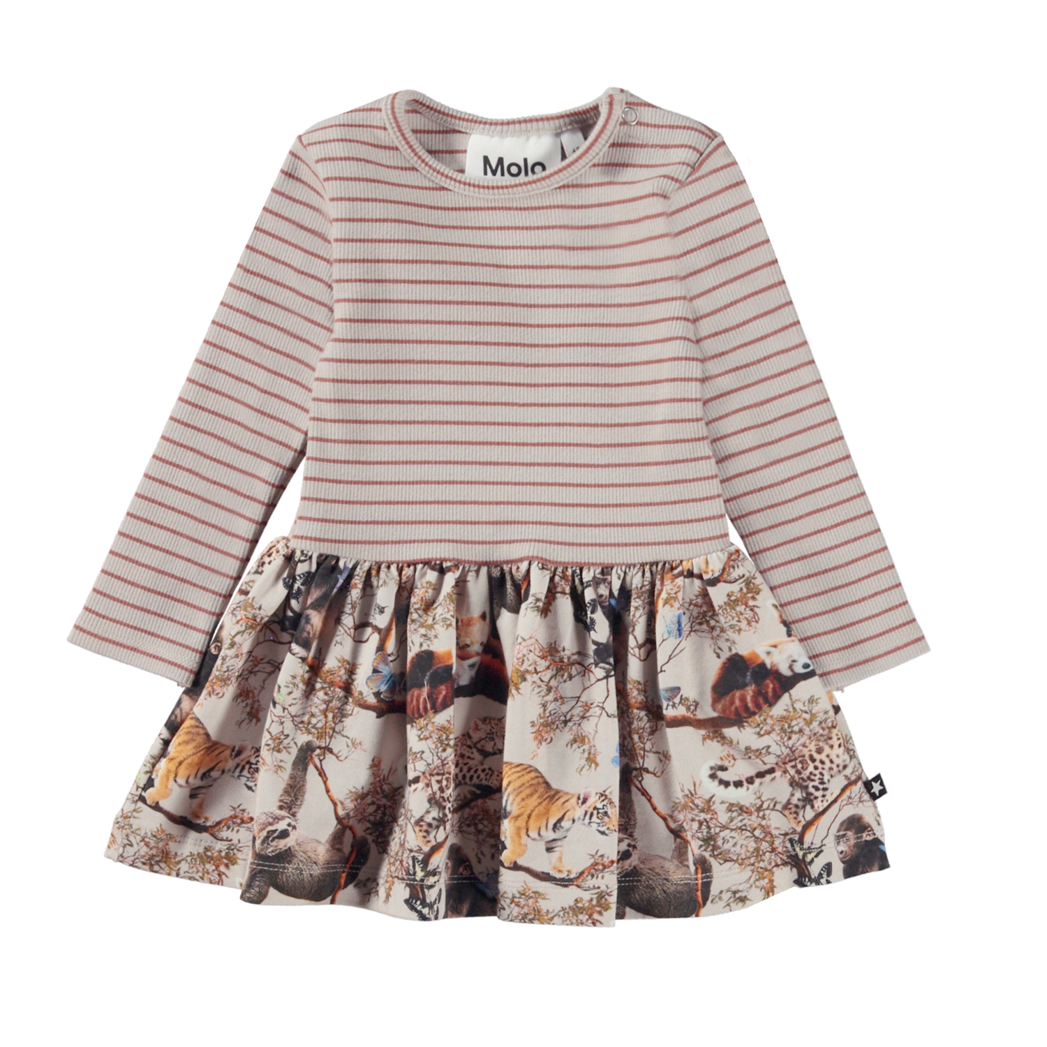 Carel er en beige langærmet babykjole fremstillet i 100% økologisk bomuldsjersey. Den øverste del af kjolen er i beige med brune striber, mens skørtet er i allover printet, Cubs Harmony, med forskellige dyreunger, der lever sammen i fred og harmoni. Carel har trykknaplukning i skulderen, som gør kjolen nem at få af og på.
