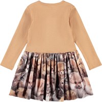 Langærmet kjole til de mindste i økologisk bomuld. Kjolen er lysebrun med print af nuttede dyr. Toppen er tætsiddende i ribbet jersey og har en rund hals med en knap på skulderen, hvilket gør den nem at tage af og på. Påsyet skørt med fin volumen.