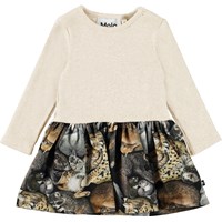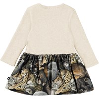 Carel er en baby kjole i to delt look med lange ærmer. Overdelen lysegrå i rib materiale, mens skørtet er med print af forskellige dyr, som er gået i hi og sover tungt.