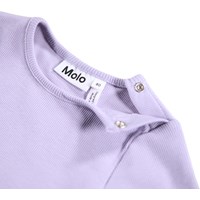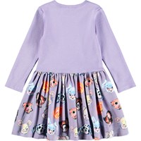 Langærmet kjole til de mindste i økologisk bomuld. Kjolen er lyslilla med print af tegnede dyr på skørtet. Toppen er tætsiddende i ribbet jersey og har en rund hals med en knap på skulderen, hvilket gør den nem at tage af og på. Påsyet skørt med fin volumen.