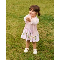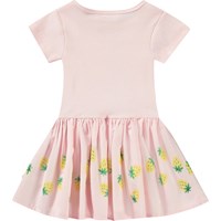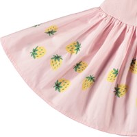 Kjole til de mindste i økologisk bomuld. Kjolen er lyserød med print af gule jordbær på skørtet. Toppen er tætsiddende i ribbet jersey, mens skørtet er i poplin, der giver kjolen volumen. Den er nem at tage på og behagelig at have på.