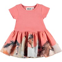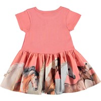 Carin er en koral farvet to-delt babykjole med korte ærmer og peplum skørt med smukke heste.