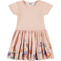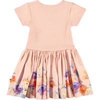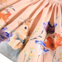Rosa kjole til de mindste i økologisk bomuld. Skørtet har print af fine dyr iklædt tøj og smukke blomster. Toppen er tætsiddende i ribbet jersey, mens skørtet er i poplin, hvilket giver kjolen volumen. Den er nem at tage på og behagelig at have på.