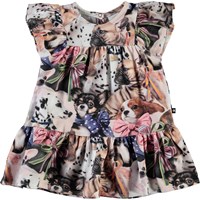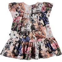 Carolle er en baby kjole med print af små hunde, som alle har sløjfe om halsen. Kjolen har flæser på skuldrene. Certificeret af Ecocert Greenlife, certifikationsnr. 197496.