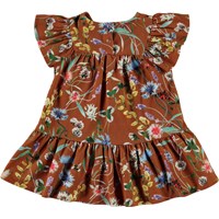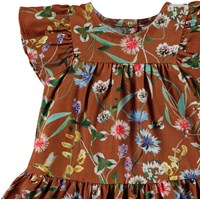 Carolle er en baby kjole i brun med print af vilde blomster. Kjolen har flæser på skuldrene.