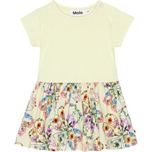 Lysegul økologisk kjole med print på skørt, til de mindste. Printet består af forskellige farverige blomster, som sammen danner både hjerter og kløvere. Kjolen har en rund halsudskæring, lukning med trykknapper, korte ærmer og et rundt skørt.