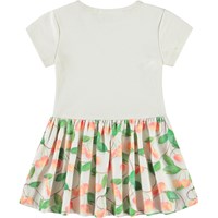 Kjole til de mindste i økologisk bomuld. Kjolen er hvid med kirsebærprint på skørtet.Toppen er tætsiddende i ribbet jersey og har en rund hals med en knap på skulderen, hvilket gør den nem at få af og på. Påsyet skørt med fin volumen.