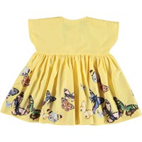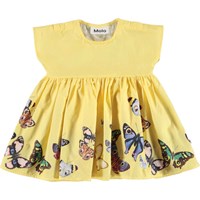 Channi er en babykjole med gul overdel og skørt med print af sommerfugle. Channi har en bred pasform og trykknapper på skuldrene gør det nemt at få den af og på.