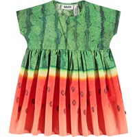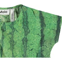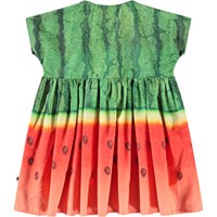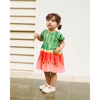 Poplinkjole i økologisk bomuld med vandmelonsprint til de mindste. Kjolen har en rund halsudskæring, et skørt med god volumen, høj talje og knaplukning ved skulder. Print af vandmelon i flotte grønne og røde farver.