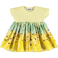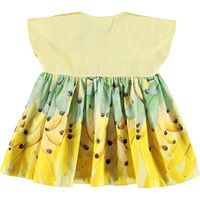 Channi er en baby kjole med gul overdel og skørt med print af bananer. Channi har en bred pasform og trykknapper på skuldrene gør det nemt at få den af og på.