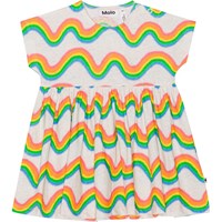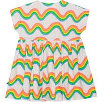 Lys kjole med allover regnbueprint, til de mindste. Printet består af bløde bølger i regnbuens farver. Kjolen har en rund halsudskæring, trykknapper i halsen, korte ærmer og rundt skørt.