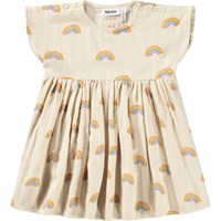 Cremefarvet kjole med regnbueprint i økologisk bomuld til de mindste. Designet med rund hals, korte ærmer, høj talje, et skørt med fin volumen og knaplukning i nakken for nem påklædning.
