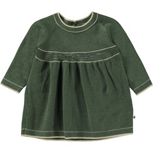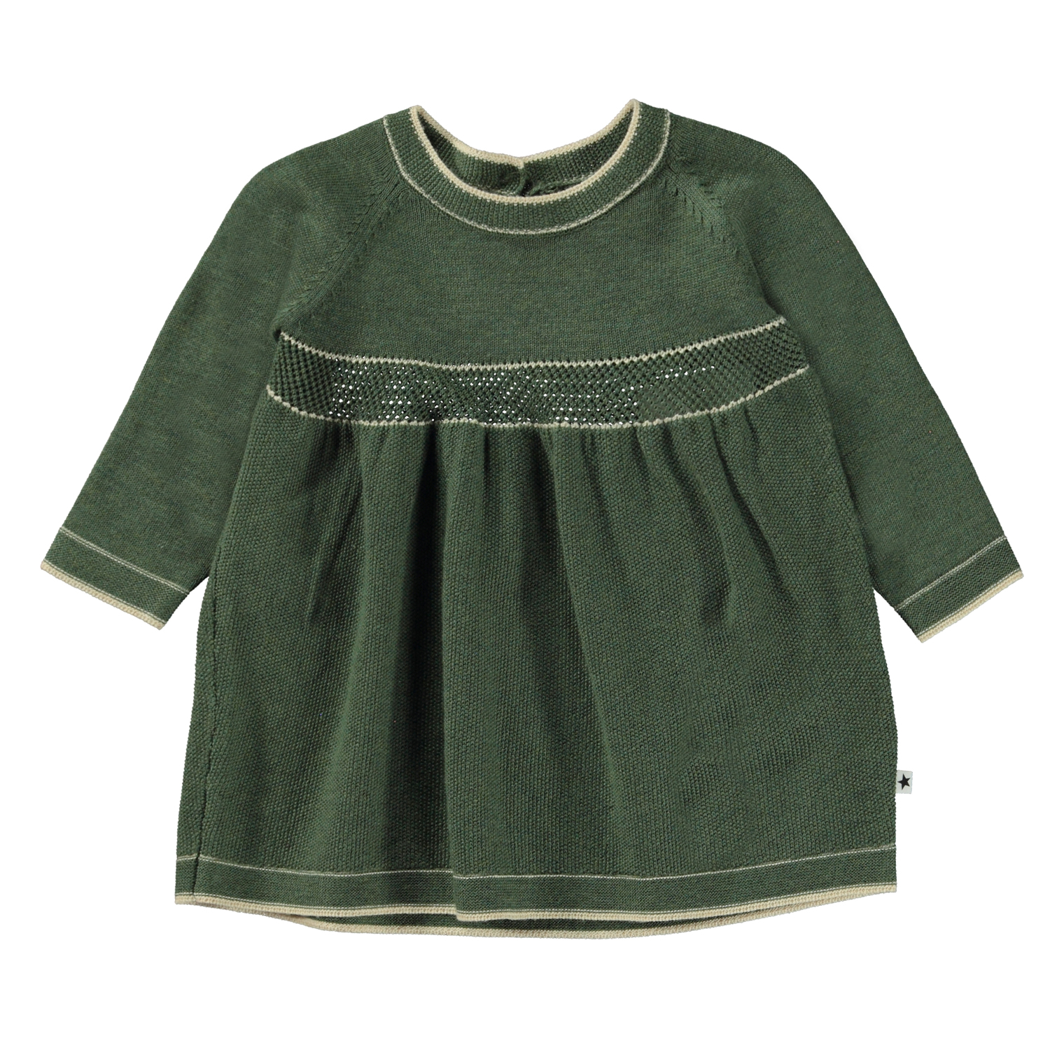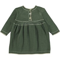 Mørkegrøn baby strikkjole med lange ærmer. Kjolen har en bred pasform og knapper i nakken.