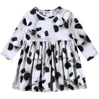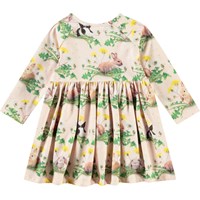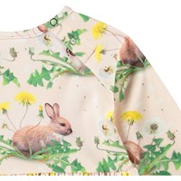 Langærmet kjole til de mindste i økologisk bomuld. Kjolen har et sødt print af kaniner og mælkebøtter.Toppen har tætsiddende raglanærmer og en rund hals med knaplukning bagpå, hvilket gør den nem at tage på. Skørtet har rynker, der giver plads til bevægelse og gør den behagelig at have på.