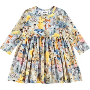Langærmet kjole til de mindste i økologisk bomuld. Kjolen er lyseblå og har et print af hæklede bamser.Toppen har tætsiddende raglanærmer og en rund hals med knaplukning bagpå, hvilket gør den nem at tage på. Skørtet har rynker, der giver plads til bevægelse og gør den behagelig at have på.