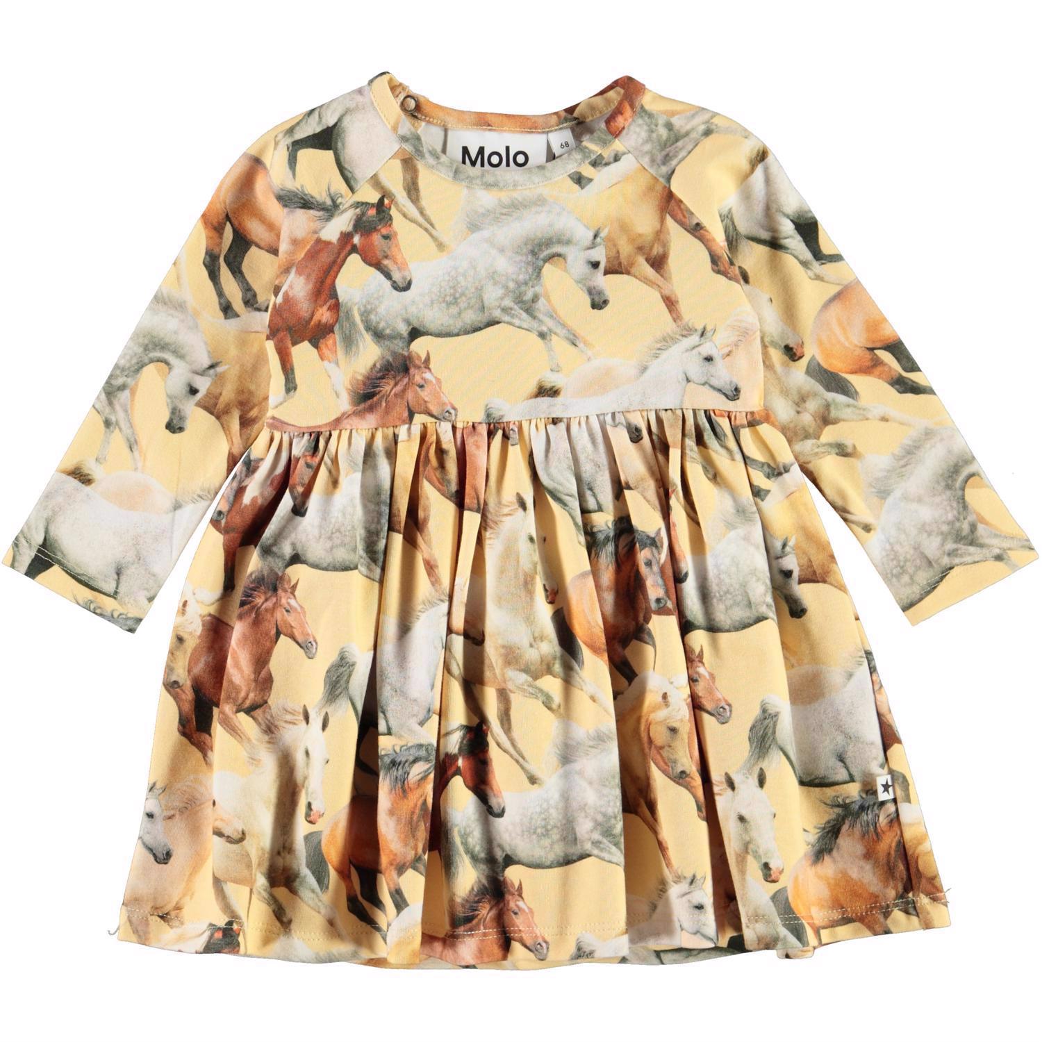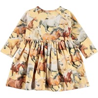 Charmaine er en gul babykjole med print af smukke løbende heste. Kjolen har lange ærmer og et skørt med flot volumen.