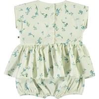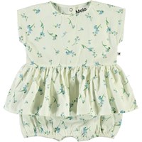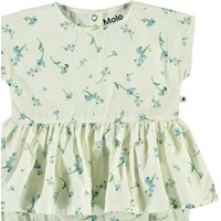 Chaya er en baby dragt med peplum skørt til de varme dage. Dragten har print af små forglem mig ej blomster. Trykknapper i nakken og mellem ben gør det let at få dragten af og på. Certificeret af Ecocert Greenlife, certifikationsnr. 197496.