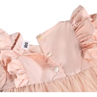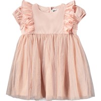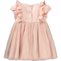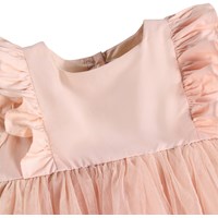 Lyserød kjole med pufærmer, flæser og bærestykke, til de mindste. Kjolen har et almindeligt skørt med et lag tyl ovenpå for ekstra fylde og struktur. Lukkes nemt med knapper i ryggen.