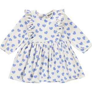 Chocho er en hvid babykjole med print af små blå hjerter. Kjolen har lange ærmer og flæser på overdelen, samt lynlås lukning i nakken.
