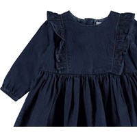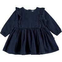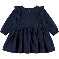 Chocho er en mørkeblå denim baby kjole med lange ærmer og flæser på overdelen. Kjolen har lynlås lukning i nakken.