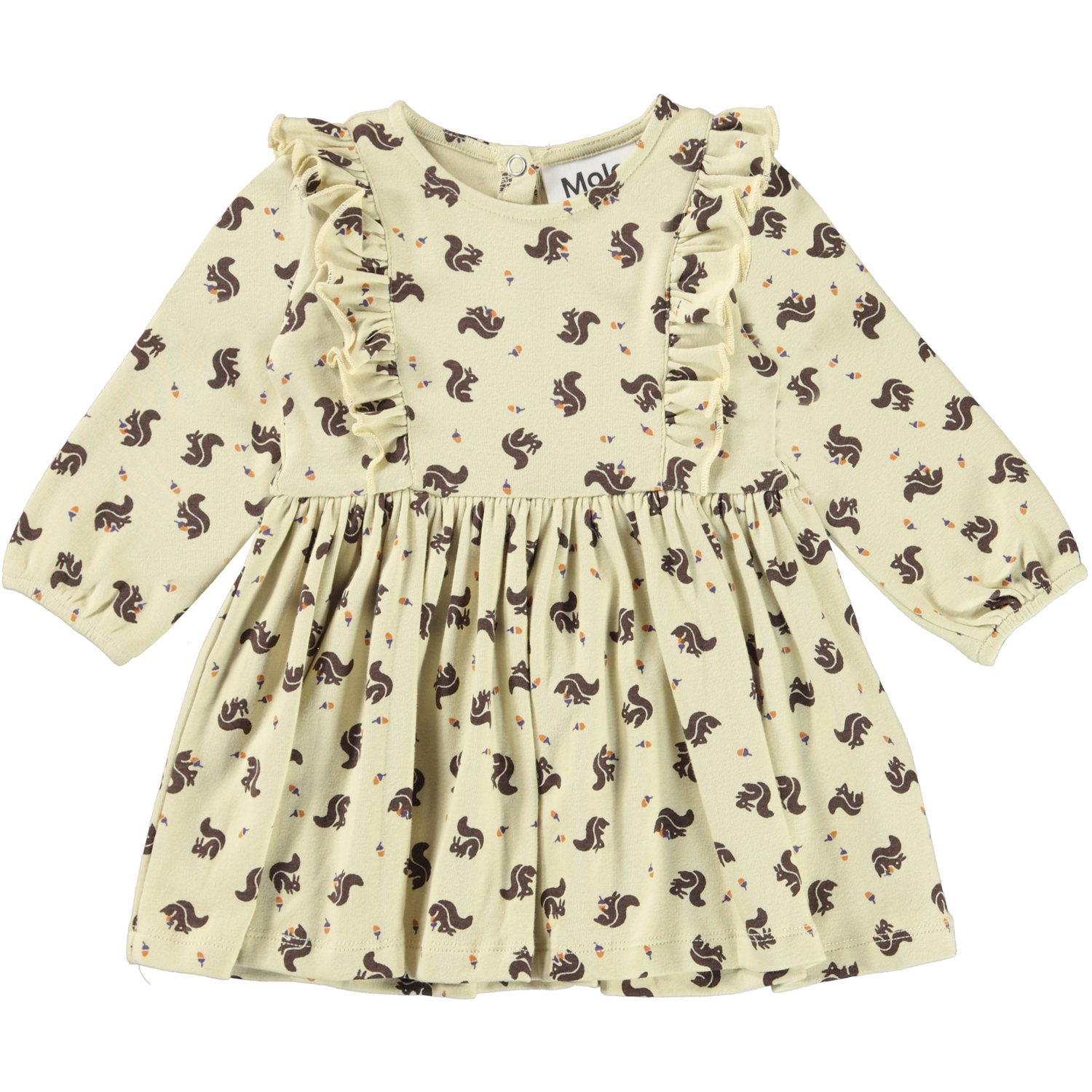 Chocho er en gul babykjole med print af små egern. Kjolen har lange ærmer og flæser på overdelen, samt lynlås lukning i nakken.