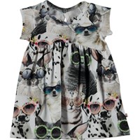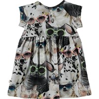 Kortærmet baby kjole med all over print af sjove dyr. Trykknapper i nakken gør det let at få kjolen af og på.