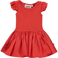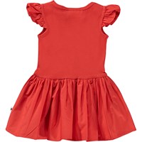 Cimi er en rød babykjole fremstillet i 100% økologisk bomuld. Toppen af kjolen er i ribjersey, mens de små ærmer og det påsyede skørt er i poplin.