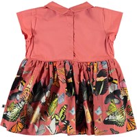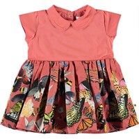 Cinna er en mørke rosa baby kjole med korte ærmer og skjortekrave. Kjolens skørt er fyldt med farverige sommerfugle og har en trykknap i nakken.