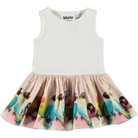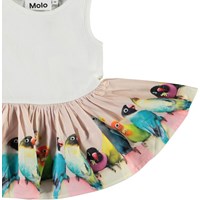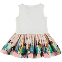 Cordelia er en baby kjole med hvid ribbet overdel og lyserødt skørt med print af små fugle. Certificeret af Ecocert Greenlife, certifikationsnr. 197496.