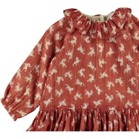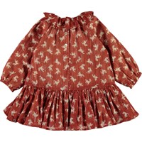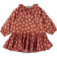 Corinne er en brun baby kjole med små heste. Kjolen har lange ærmer og flæsekant ved kraven. Kjolen åbnes i nakken.