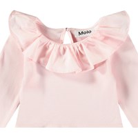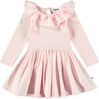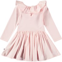 Lyserød poplinkjole i økologisk bomuld til de mindste. Toppen er i ribbet jersey med en sød krave, og skørtet er i poplin. Kjolen har en fin knaplukning bagpå, som gør den nem at få af og på.