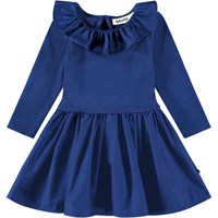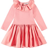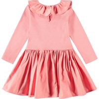 Koralfarvet kjole til de mindste lavet af økologisk bomuld. Kjolen har en tætsiddende jerseytop med lange ærmer og en poplinkrave. Den har også et voluminøst poplin skørt, der matcher kraven. Der er en knap i nakken, som gør det nemt at få kjolen på.