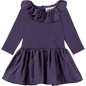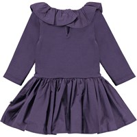 Crystala er en lilla babykjole med overdel i rib og fin flæsekrave. Kjolen har en knappelukning i nakken.