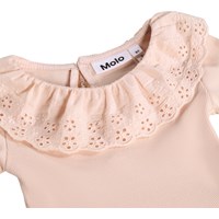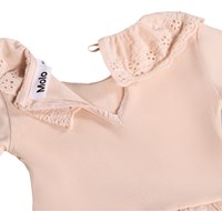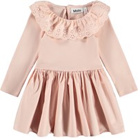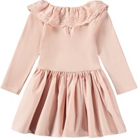 Lyserød kjole i økologisk bomuld til de mindste. Kjolen har lange ærmer i ribbet jersey, en broderet krave og et poplinskørt med let volumen. Lukkes nemt med en knap i ryggen.