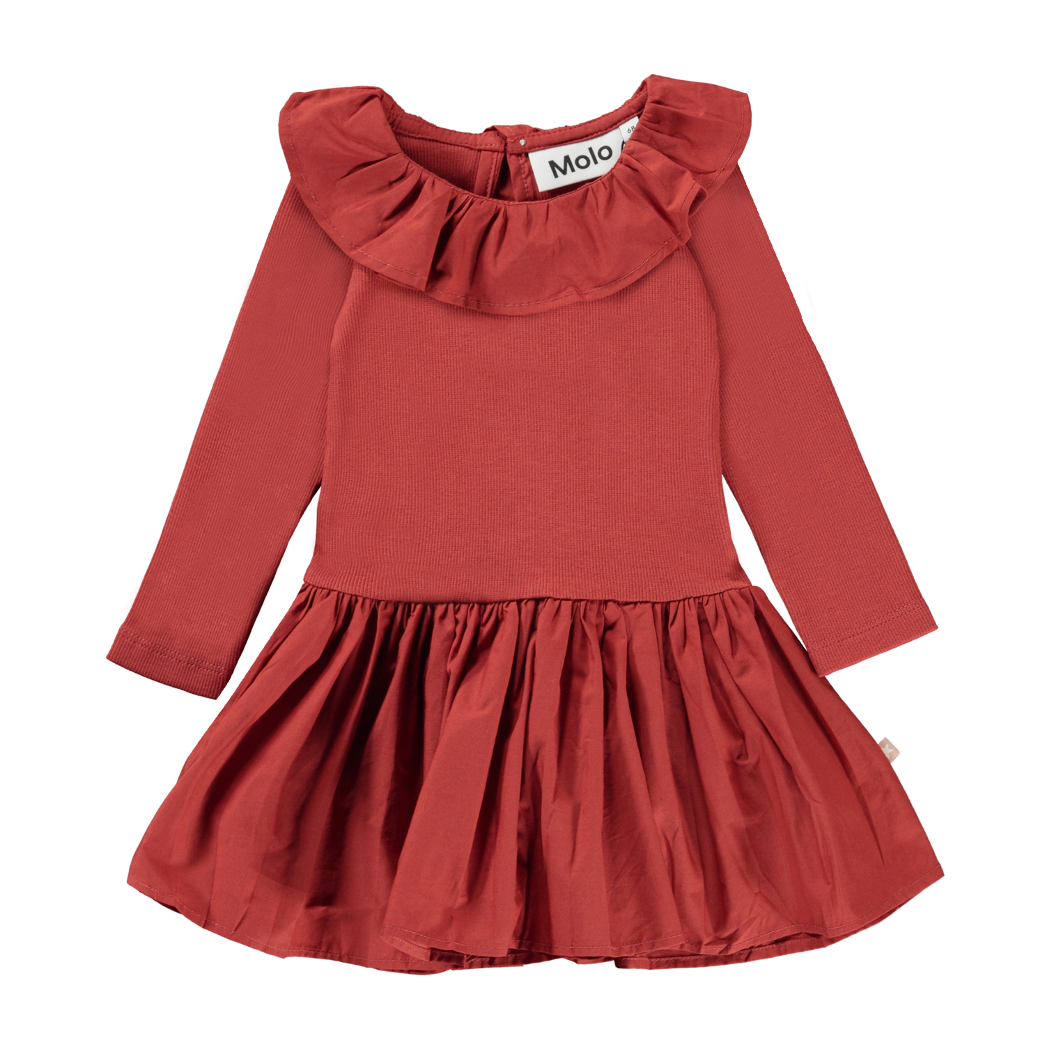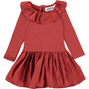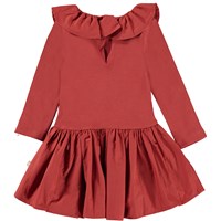 Crystala er en rød babykjole med overdel i rib og fin flæsekrave. Kjolen har en knappelukning i nakken.