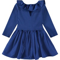 Marineblå kjole til de mindste lavet af økologisk bomuld. Kjolen har en tætsiddende jerseytop med lange ærmer og en poplinkrave. Den har også et voluminøst poplin skørt, der matcher kraven. Der er en knap i nakken, som gør det nemt at få kjolen på.