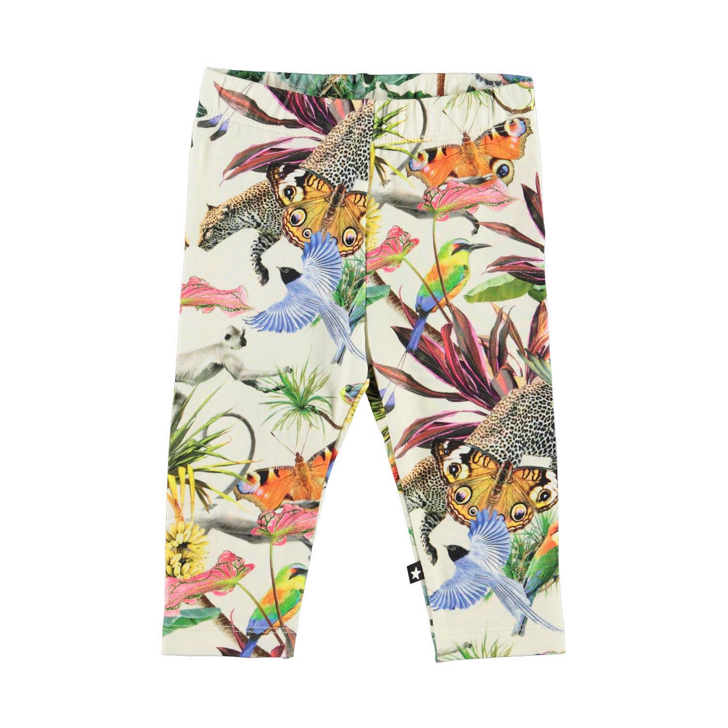 Klassiske baby leggings med print af en fantasijungle. Den elastiske talje og det bløde materiale sikrer en god pasform. Certificeret af Ecocert Greenlife, certifikationsnummer 197496.