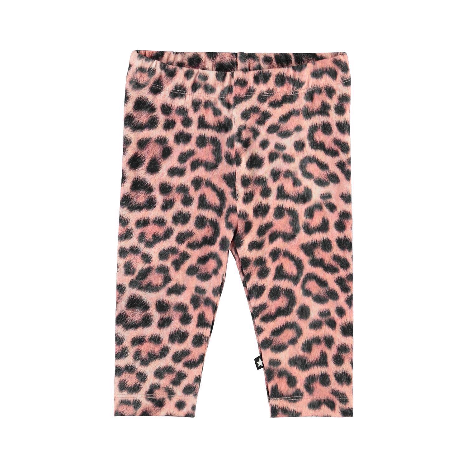 Klassiske baby leggings med rosa leopardprint. Den elastiske talje og det bløde materiale sikrer en god pasform. Certificeret af Ecocert Greenlife, certifikationsnummer 197496.