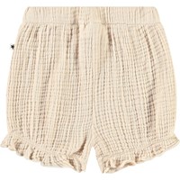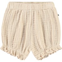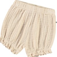 Sandfarvede bloomer-shorts i crepet økologisk bomuld til de mindste. Shortsene har elastik i taljen og omkring lårene samt flæsekanter ved lårene. Perfekte små shorts til varme sommerdage.