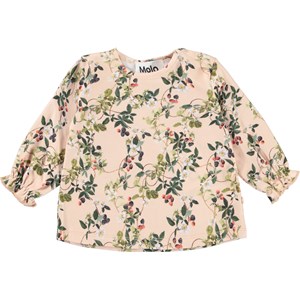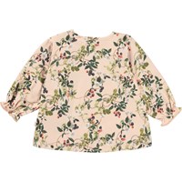Elina er en rosa babybluse med print af brombærranker. Blusen har søde ærmer med elastisk ærmeafslutning, samt knappelukning i kraven.