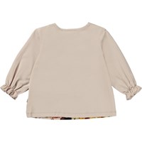 Rosa babybluse med print på fronten af en hest omgivet af flotte blomster. Blusen har søde ærmer med elastisk ærmeafslutning, samt knappelukning i kraven.