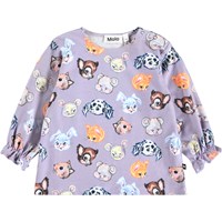Lyslilla langærmet bluse til de mindste i økologisk bomuldsjersey med print af søde tegnede dyr. Blusen har en løs pasform og ærmer med elastik ved håndleddene, hvilket giver en lille flæsekant. Der er knaplukning ved skulderen, hvilket gør den nem at få af og på.