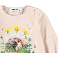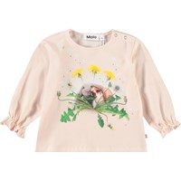 Langærmet bluse til de mindste i økologisk bomuldsjersey. Blusen har en løs pasform og ærmer med elastik ved håndleddene, hvilket giver en lille flæsekant. Der er knaplukning ved skulderen, hvilket gør den nem at få af og på. Blusen er lyserød med et frontprint af kaniner og mælkebøtter.