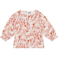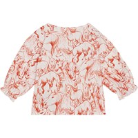 Råhvid langærmet bluse i blødt økologisk bomuldsjersey. Blusen har en løs pasform, søde ærmer med elastisk ærmeafslutning, samt knaplukning ved skulderen der gør den nem at få af og på. Blusen har et rødt alloverprint af håndtegnet smukke heste.