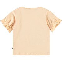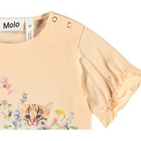 T-shirt til de mindste i økologisk bomuldsjersey. T-shirten har en løs pasform og ærmer med elastik ved kanten, hvilket giver en lille flæsekant. Der er knaplukning ved skulderen, hvilket gør den nem at få af og på. Ferskenfarvet med et frontprint af dyreunger i blomsterbed.