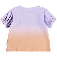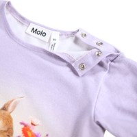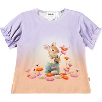 Lyslilla og rosa t-shirt til de mindste i økologisk bomuldsjersey, med print af en lille kanin og blomster. T-shirten har en løs pasform og ærmer med elastik ved kanten, hvilket giver en lille flæsekant. Der er knaplukning ved skulderen, hvilket gør den nem at få af og på.