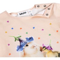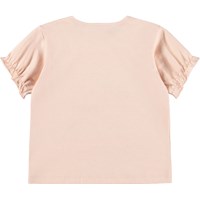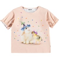 Lyserød t-shirt med dyreprint til de mindste, i blød økologisk bomuldsjersey. Har løs pasform, korte ærmer med elastikkant og fin flæseeffekt. Knaplukning på skulderen gør den nem at tage af og på.