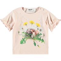 T-shirt til de mindste i økologisk bomuldsjersey. T-shirten har en løs pasform og ærmer med elastik ved kanten, hvilket giver en lille flæsekant. Der er knaplukning ved skulderen, hvilket gør den nem at få af og på. Lyserød med et frontprint af kaniner og mælkebøtter.