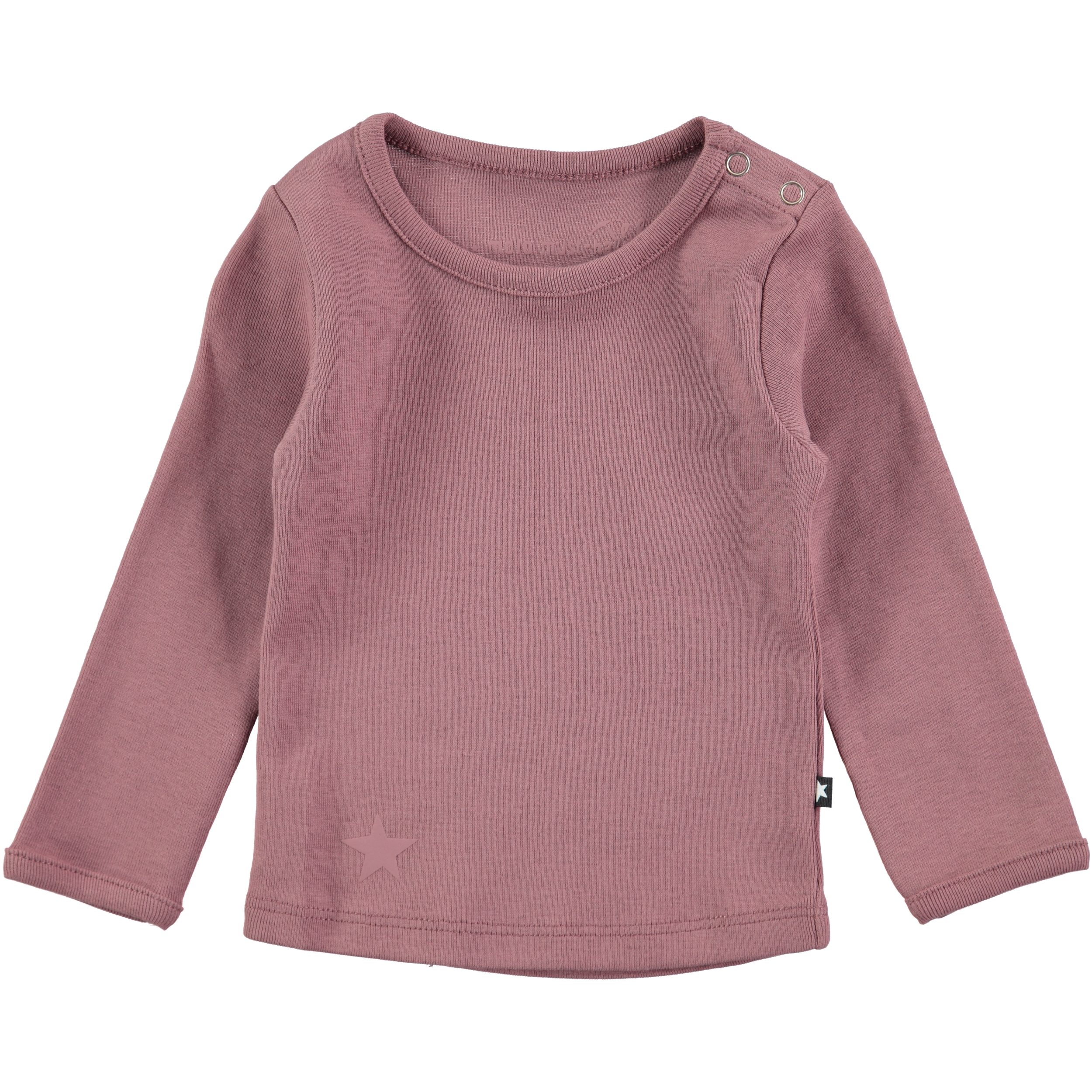 Langærmet t-shirt med stjernedetalje på fronten. Åbnes og lukkes let med en trykknap på den ene skulder.
