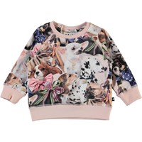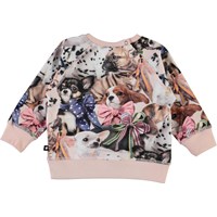 Elsa er en lyserød babybluse, som har print af små hund med sløjfer om halsen. Elsa har raglanærmer og trykknap i nakken, der gør det nemt at få blusen af og på.